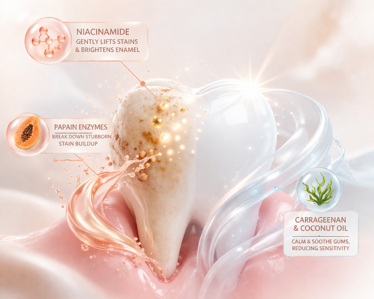 To break down stubborn buildup, natural papain enzymes dissolve protein-based stains without the need for harsh scrubbing. Meanwhile, soothing ingredients like carrageenan and coconut oil help calm irritated gums and reduce sensitivity, so you can whiten comfortably every day.